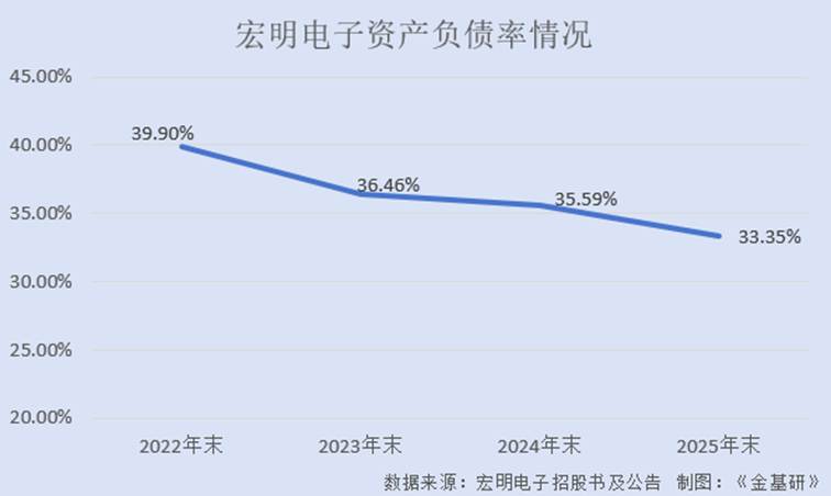 此外,2022-2025年,宏明电子的资产负债率持续下行,分别为39.90%、36.46%、35.59%、33.35%。