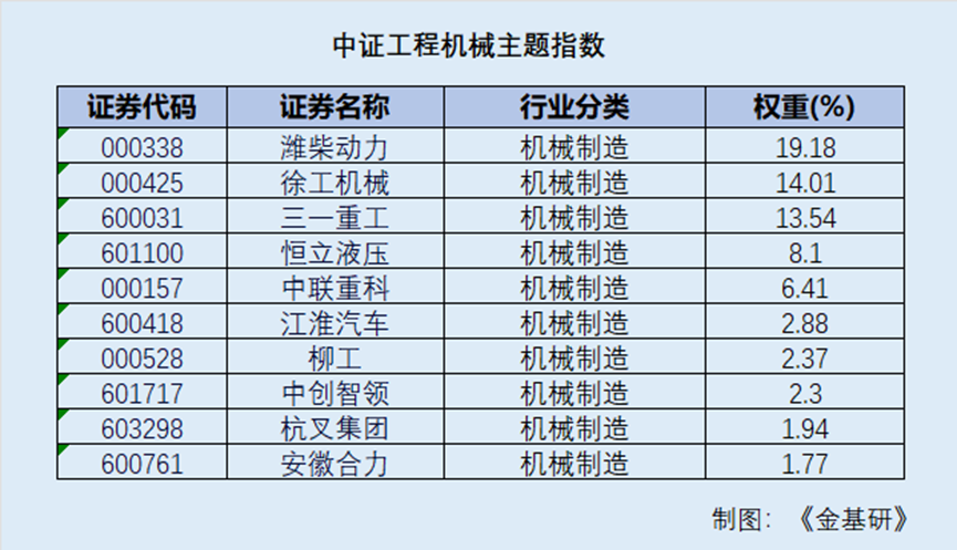 中证工程机械主题指数前十大成分股分别为潍柴动力、徐工机械、三一重工、恒立液压、中联重科、江淮汽车、柳工、中创智投、杭叉集团、安徽合力。既包含三一重工、徐工机械、中联重科等全球整机制造龙头,也有恒立液压等核心零部件领军企业,实现了工程机械产业链从核心零部件、整机制造到智能施工应用的全面覆盖。