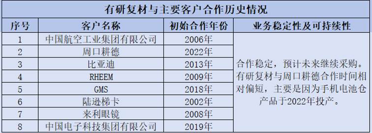 根据招股书数据,2022-2024年及2025年1-6月,有研复材各期的前五大客户(共涉及8家)分别为中国航空工业集团有限公司、周口耕德、比亚迪、RHEEM、GMS、陆逊梯卡、来利眼镜、中国电子科技集团有限公司,其与有研复材初始合作年份分别为2006年、2022年、2013年、2009年、2018年、2002年、2008年、2019年。