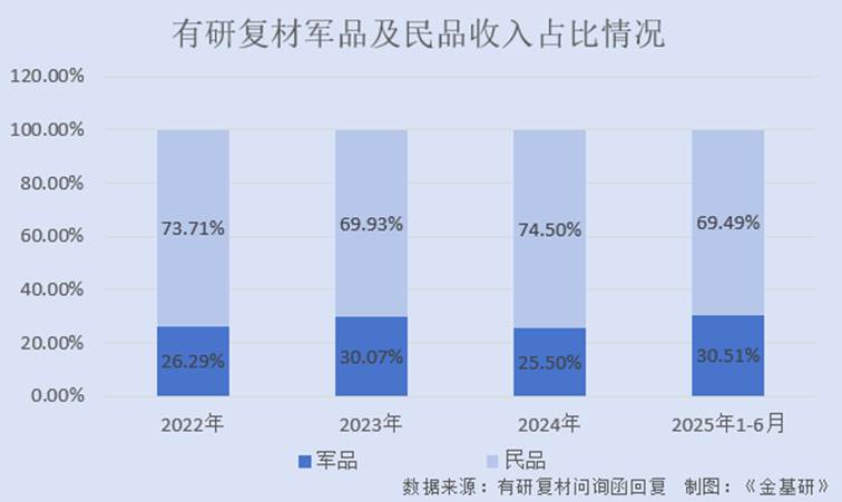 2022-2024年及2025年1-6月,有研复材军品主营业务收入占比分别为26.29%、30.07%、25.50%、30.51%;民品主营业务收入占比分别为73.71%、69.93%、74.50%、69.49%。
