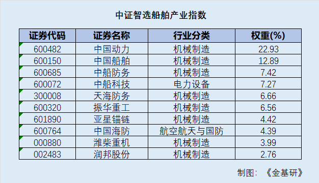 具体而言,中证智选船舶产业指数(932420)前十大权重分别是中国动力、中国船舶、中船防务、中船科技、天海防务、振华重工、亚星锚链、中国海防、潍柴重机、润邦股份。总装制造龙头中国船舶,动力系统供应商中国动力以及潍柴重机、亚星锚链等核心零部件企业均在成分股之列。