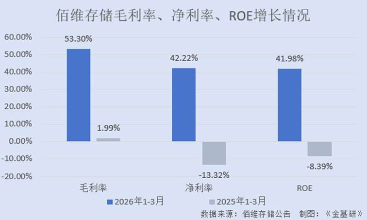 同时,佰维存储的盈利能力持续增强。2025年,佰维存储的毛利率、净利率、ROE分别为21.44%、7.42%、19.78%,同比分别上升3.25个百分点、5.40个百分点、12.41个百分点。2026年1-3月,上述三项指标分别为53.30%、42.22%、41.98%,同比分别上升51.31个百分点、55.54个百分点、50.37个百分点。