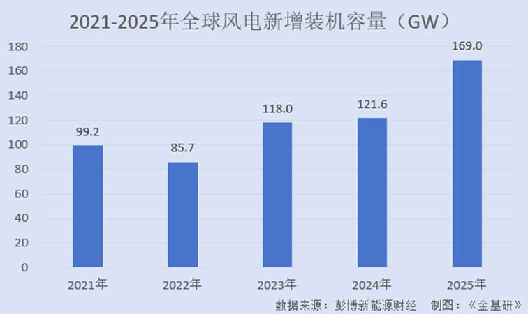 根据彭博新能源财经(BNEF)数据,2021-2025年,全球风电新增装机容量分别为99.2GW、85.7GW、118.0GW、121.6GW、169.0GW,CAGR为14.25%。另据GWEC(全球风能理事会)预计,2030年全球风电新增装机容量将增长至194GW。