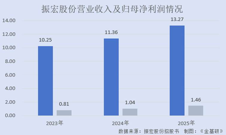 根据招股书数据,2023-2025年,振宏股份的营业收入分别为10.25亿元、11.36亿元、13.27亿元,CAGR为13.78%(注:振宏股份2025年财务数据经中汇会计师事务所审阅,但未经审计,下文同)。