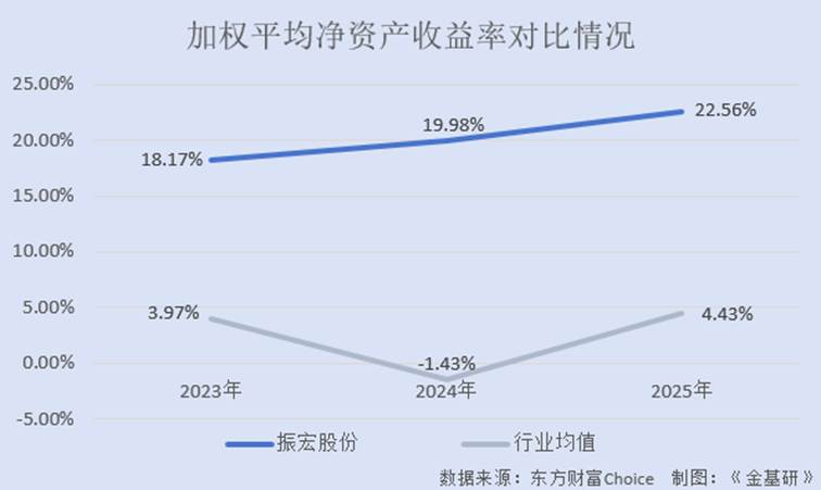 2023-2025年,振宏股份的毛利率分别为17.10%、18.30%、19.58%,ROE分别为18.17%、19.98%、22.56%。
