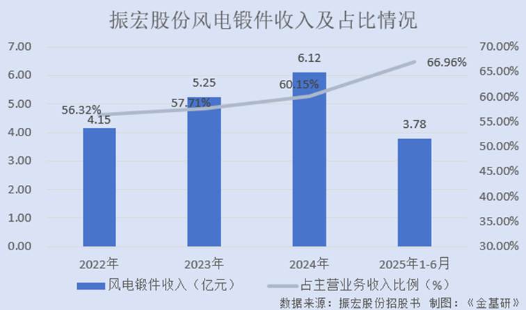 2022-2024年及2025年1-6月,振宏股份的风电锻件收入分别为4.15亿元、5.25亿元、6.12亿元、3.78亿元,占主营业务收入的比例分别为56.32%、57.71%、60.15%、66.96%,均呈逐年增长趋势。