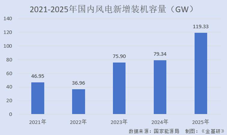 根据国家能源局数据,2021-2025年,国内风电新增装机容量分别为46.95GW、36.96GW、75.90GW、79.34GW、119.33GW,CAGR达26.26%。