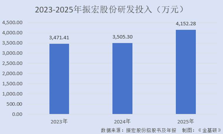 2023-2025年,振宏股份研发投入分别为3,471.41万元、3,505.30万元、4,152.28万元,CAGR为9.37%。