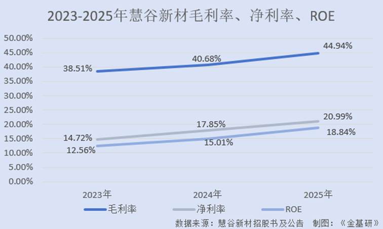 2023-2025年,慧谷新材的毛利率分别为38.51%、40.68%、44.94%;净利率分别为14.72%、17.85%、20.99%;ROE分别为12.56%、15.01%、18.84%。三大核心盈利指标连续三年同步上行,充分说明慧谷新材的盈利质量持续增强。