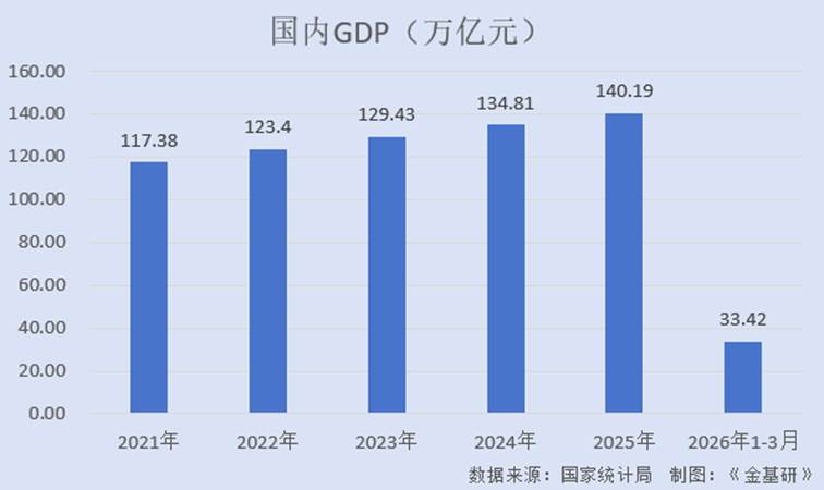 根据国家统计局数据,2021-2025年及2026年1-3月,国内生产总值(GDP)分别为117.38万亿元、123.40万亿元、129.43万亿元、134.81万亿元、140.19万亿元、33.42万亿元。其中,2026年1-3月国内GDP同比增长5.0%。