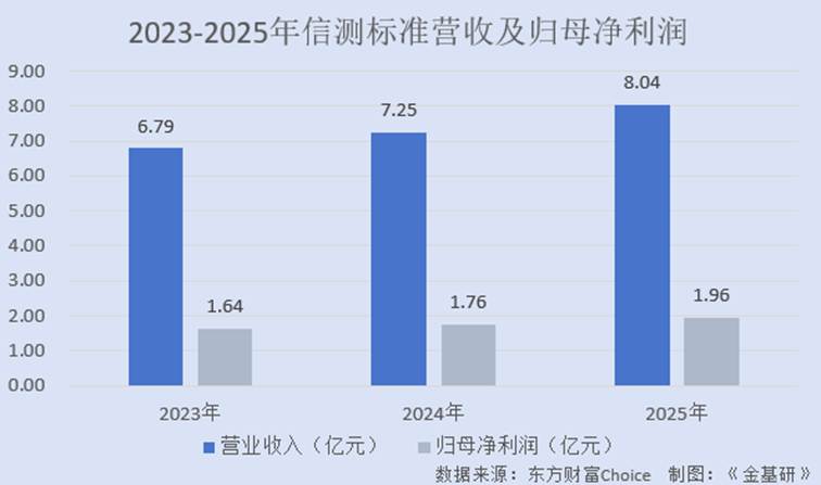 2023-2025年,信测标准的营业收入分别为6.79亿元、7.25亿元、8.04亿元,CAGR为8.77%;归母净利润分别为1.64亿元、1.76亿元、1.96亿元,CAGR为9.57%。