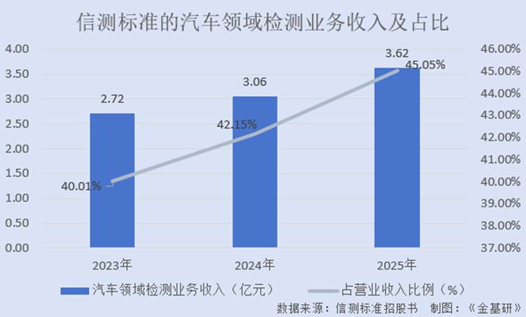 2023-2025年,信测标准的汽车领域检测业务收入分别为2.72亿元、3.06亿元、3.62亿元,占当期营业收入的比例分别为40.01%、42.15%、45.05%,增长势头显著。2025年,信测标准的汽车领域检测业务毛利率达68.85%,同比增加1.14%,呈现出高毛利特征。