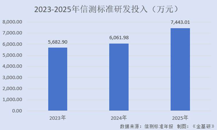 2023-2025年,信测标准的研发投入金额分别为5,682.90万元、6,061.98万元、7,443.01万元,CAGR为14.44%;上述投入占当期营业收入的比例分别为8.36%、8.36%、9.26%。