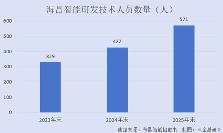 根据招股书数据,2023-2025年各期末,海昌智能的研发技术人员数量分别为329人、427人、571人,占员工总数的比例分别为36.76%、37.16%、37.57%。
