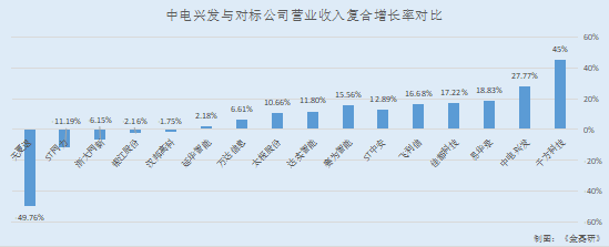 同期,中电兴发对标公司千方科技、易华录、佳都科技、飞利信、ST中安、赛为智能、达实智能、太极股份、万达信息、延华智能、汉邦高科、银江股份、浙大网新、ST网力、天夏退营业收入复合增长率,分别为45%、18.83%、17.22%、16.68%、12.89%、15.56%、11.8%、10.66%、6.61%、2.18%、-1.75%、-2.16%、-6.15%、-11.19%、-49.76%,上述对标公司营业收入复合增长率均值为5.76%。