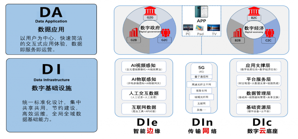 上述提及,中电兴发的智慧城市架构为边/云/用三位一体。再进一步,中电兴发智慧城市架构更准确的说是上下两部分构成,即一个统一的数字基础设施DI和一个统一的数据应用DA,也是中电兴发智慧城市业务的新赛道——DI+DA的全局全域智慧城市建设。