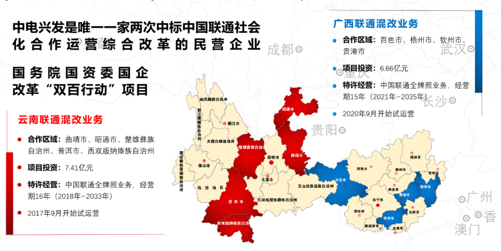 据公开信息显示,早在2017年,中电兴发就率先参加了云南联通第一批本地网试点改革,2019年5月17日,中电兴发与中国联通云南省分公司签署了“双百行动”综合改革合作协议,正式启动了云南联通全域社会化合作。2019年12月,中电兴发又通过广西联通《广西联通社会化合作运营项目》的招募评选程序,成为广西联通综合改革的合作方。2020年5月19日,与中国联通广西分公司签署了《中国联合网络通信有限公司广西壮族自治区分公司综合改革合作协议》,推动广西联通改革区域高质量发展。
