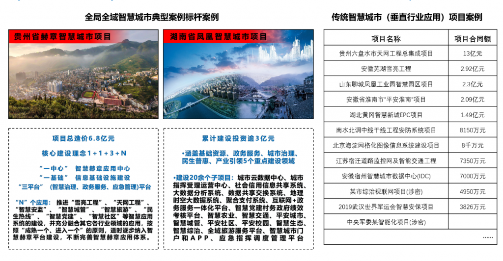 其中,湖南省凤凰智慧城市项目,累计建设投资逾3亿元,涵盖基础资源、政务服务、城市治理、民生普惠、产业引领5个重点建设领域,建设20余个子项目。