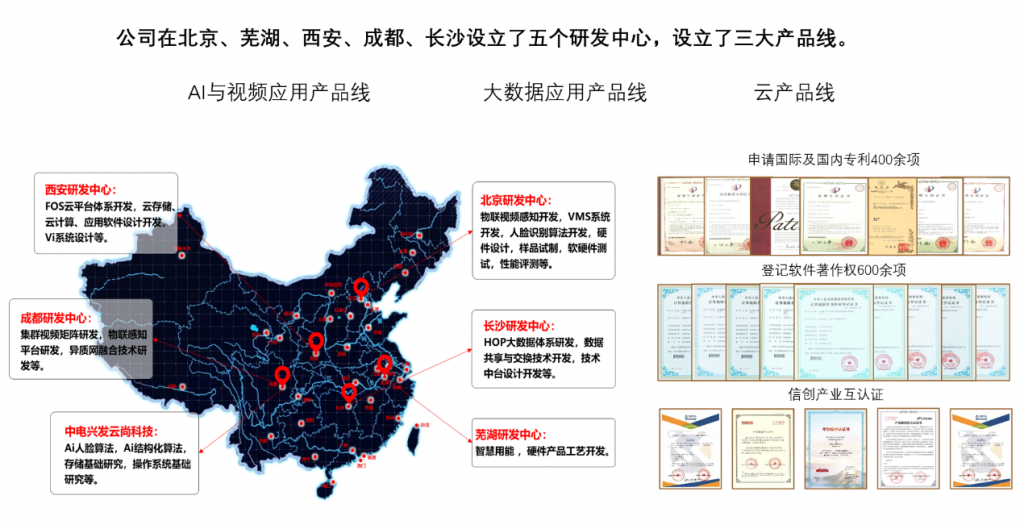 追溯历史,从2007年开始,中电兴发就进行智能安防、智能交通等高清视频感知产品的研发,进军平安城市、智能交通等业务领域。后来,中电兴发不断在智慧城市、云计算与云存储、大数据、人工智能、物联网等方面进行软、硬件产品的技术研发储备,陆续在北京、芜湖、西安、成都、长沙设立了五个研发中心,承担不同方向技术和产品的研发。