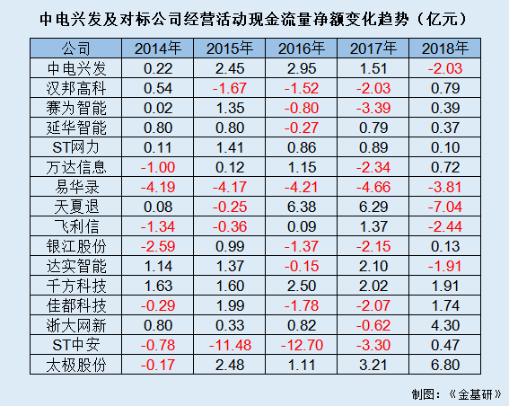 展开来看,据东方财富Choice数据,中电兴发对标公司的经营活动现金流量净额呈现波动态势,大部分对标公司经营活动现金流量多年为净流出状态。2014-2017年,除中电兴发外,对标公司中只有ST网力、千方科技保持正向的净额流入,其余均出现净额流出。
