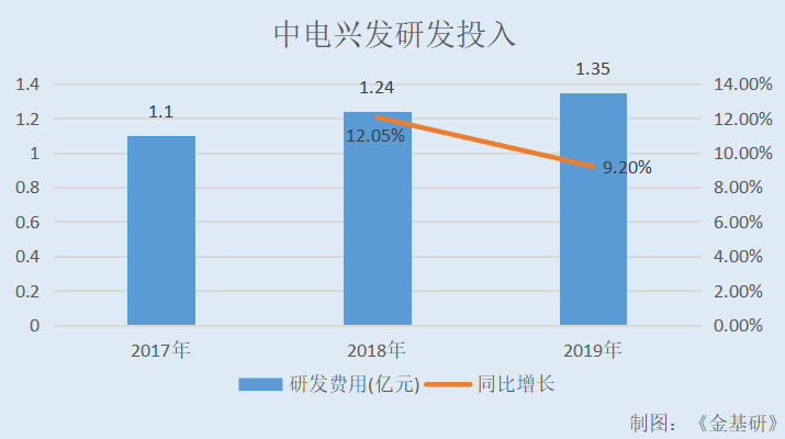 作为国内领先的智慧中国核心技术、产品与全面解决方案供应商、运营服务商,中电兴发始终坚持走“自主可控、国产代替”的技术创新发展路线,不断加大科研开发投入。2017年年报及东方财富Choice数据显示,2017-2019年,中电兴发的研发费用分别为1.1亿元、1.24亿元、1.35亿元,2018-2019年分别同比增长12.05%、9.2%。
