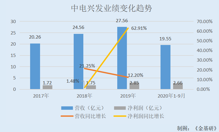 据东方财富Choice数据,2017-2019年及2020年1-9月,中电兴发的营业收入分别为20.26亿元、24.56亿元、27.56亿元、19.55亿元,2018-2019年分别同比增长21.25%、12.2%。