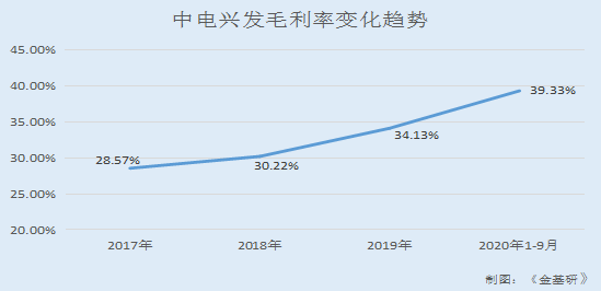 2017-2019年及2020年1-9月,中电兴发的毛利率分别为28.57%、30.22%、34.13%、39.33%。