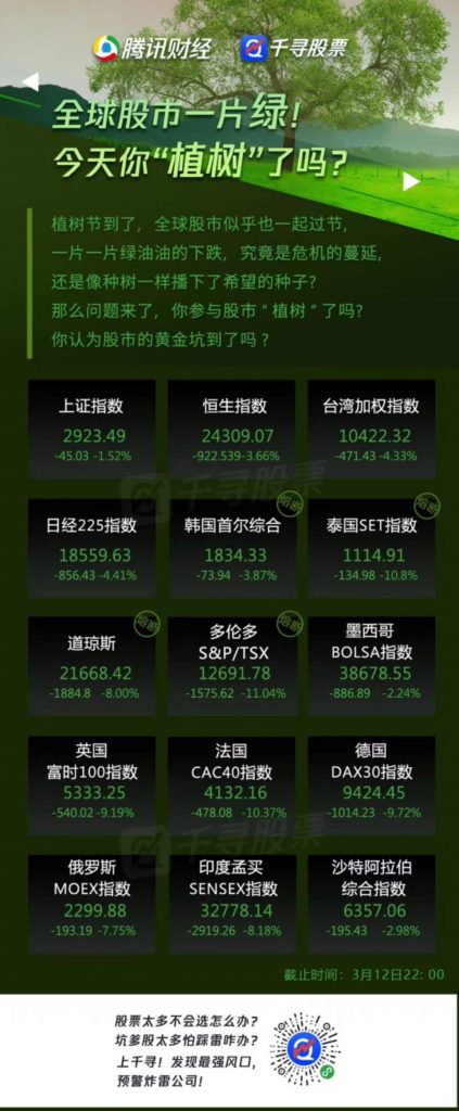 昨日,美股周四大幅低开,三大股指全部跌入熊市,触发史上熔断机制,美股惨遭“血洗”。随着疫情的蔓延和“石油战”的加剧,全球股市也狂跌不止,市场哀嚎遍野。在植树节的气氛下,全球股市却莫名有些应节,呈现一片“绿意盎然”的景象,让人唏嘘不已。