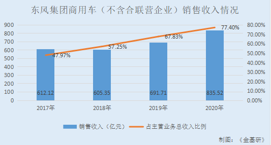据招股书及2020年年报,2017-2020年,东风集团商用车(不含合联营企业)的销售收入分别为612.12亿元、605.35亿元、691.71亿元、835.52亿元,占当期主营业务总收入的比例分别为47.97%、57.25%、67.83%、77.4%。