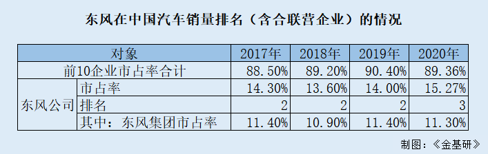据招股书及中国汽车工业协会数据,经《金基研》测算,2017-2020年,东风集团控股股东东风公司的市场占有率分别为14.3%、13.6%、14%、15.27%,稳居行业前三。其中,东风集团整车销量的市场占有率分别为11.4%、10.9%、11.4%、11.3%。