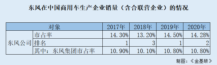 据招股书、2020年年报及中国汽车工业协会数据,经《金基研》测算,2017-2020年,东风公司商用车销量的市场占有率分别为14.3%、13.2%、14.5%、14.28%,分别位列行业第一位、第三位、第一位、第二位。其中,东风集团商用车销量的市场占有率分别为10.9%、10.1%、10.8%、10.8%。