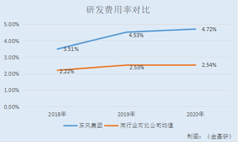 据东方财富Choice及2020年年报数据,经《金基研》测算,2018-2020年,东风集团的研发费用分别为38.61亿元、47.42亿元、50.98亿元,研发费用率分别为3.51%、4.53%、4.72%。