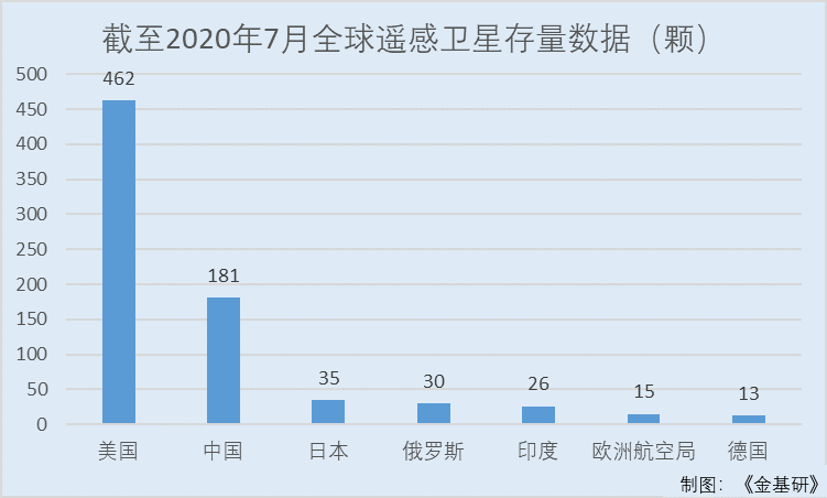 据公开信息,截至2020年9月,在轨运行的824颗遥感卫星由全球45个国家和地区所有,包括各类军用遥感卫星以及政府部门和企业所有的民用遥感卫星。其中美国、中国、欧盟、日本、俄罗斯、印度6个国家和地区各自的遥感卫星数量均超过15颗,美国是全球拥有遥感卫星数量最多的国家,目前共有462颗遥感卫星在轨运行,中国共有181颗卫星在轨运行,在轨卫星数量仅次于美国。