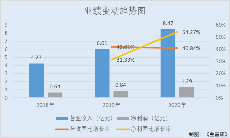 2018-2020年,航天宏图实现的营业收入分别为4.23亿元、6.01亿元、8.47亿元,2019-2020年分别同比增长42.01%、40.84%。