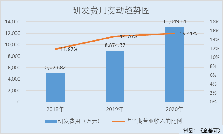 2018-2020年,航天宏图研发投入合计分别为5,023.82万元、8,874.37万元、13,049.64万元,占当期营业收入的比例分别为11.87%、14.76%、15.41%。
