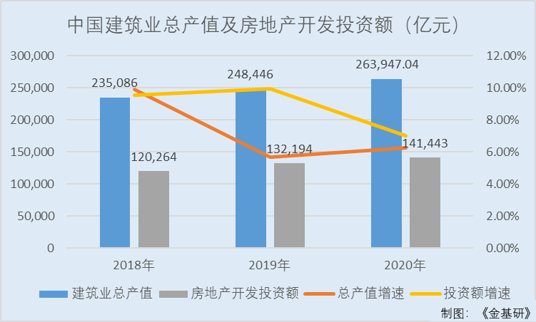 根据国家统计局公布的数据,2018-2020年,中国建筑业总产值分别为235,086亿元、248,446亿元和263,947.04亿元,增速分别为9.88%、5.68%和6.24%。