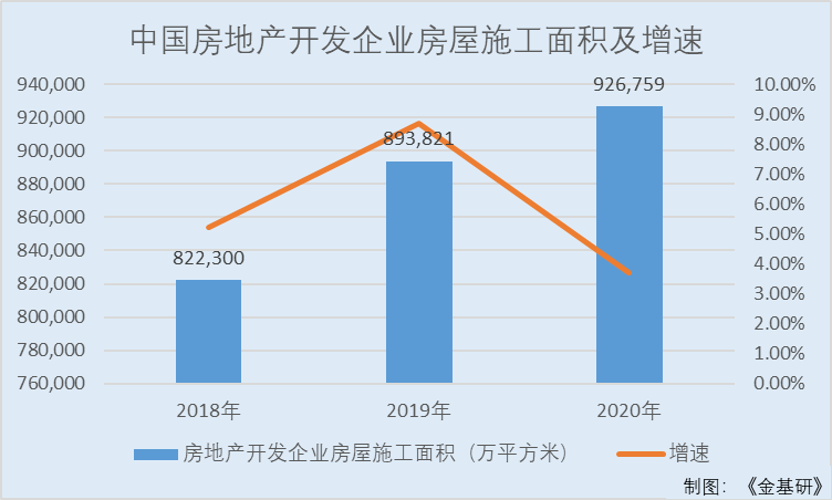 同期,中国房地产开发企业房屋施工面积分别为822,300万平方米、893,821万平方米和926,759万平方米,同比增速分别为5.22%、8.7%和3.7%。
