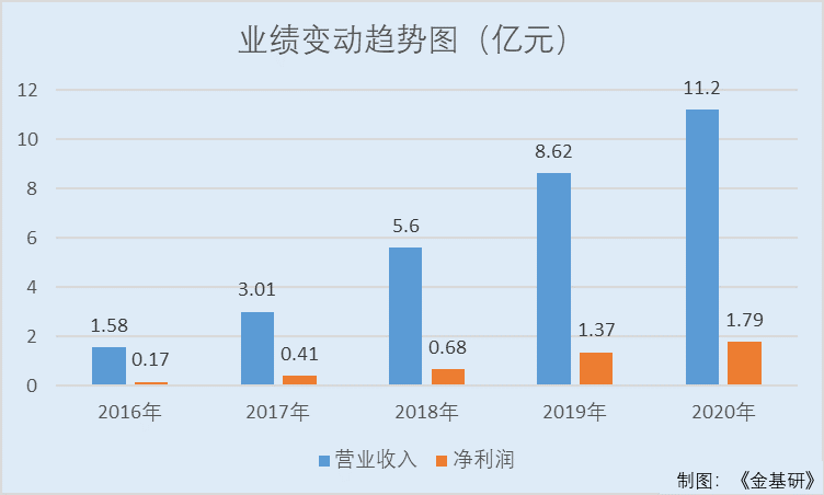 2016-2020年,志特新材实现的营业收入分别为1.58亿元、3.01亿元、5.6亿元、8.62亿元、11.2亿元,2017-2020年分别同比增长90.11%、85.86%、54.01%、29.89%。