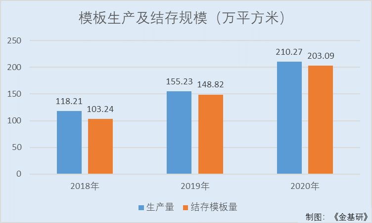 2018-2020年,志特新材模板的生产量分别为118.21万平方米、155.23万平方米和210.27万平方米;期末结存模板量分别为103.24万平方米、148.82万平方米和203.09万平方米;结存的模板净值分别为5.49亿元、7.25亿元和7.81亿元。