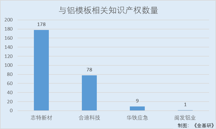 同期,志特新材同行业可比公司浙江华铁应急设备科技股份有限公司(以下简称“华铁应急”)、福建省闽发铝业股份有限公司(以下简称“闽发铝业”)、广东合迪科技股份有限公司(以下简称“合迪科技”)拥有的知识产权中分别约9项、1项、78项与铝模板相关。
