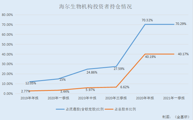 2019年年报、2020各定期报告及2021年一季报显示,机构持仓股数占海尔生物流通股(含锁定股)的比例分别为12.05%、15%、24.86%、27.59%、70.32%、70.29%;占海尔生物总股本的比例分别为2.77%、3.44%、5.97%、6.62%、40.19%、40.17%。
