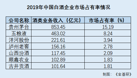根据上市公司年度报告,2019年销售规模达到100亿元以上的白酒企业营收共计2,016.22亿元,市场占有率35.89%。其中,贵州茅台市场占有率最高,达到15.19%,五粮液位居第二,市场占有率8.24%。