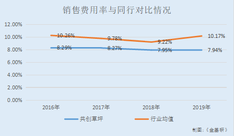 2016-2020年及2021年第一季度,共创草坪的销售费用率分别为8.29%、8.27%、7.95%、7.94%、4.17%及4.01%。2016-2019年,同行业上市公司傲胜股份、威腾体育公司的销售费用率均值分别为10.26%、9.78%、9.22%、10.17%。