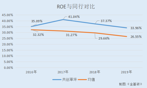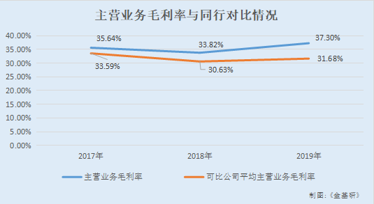 据招股书,2017-2019年,共创草坪的主营业务毛利率分别为35.64%、33.82%、37.3%;同期,同行业可比公司傲胜股份、威腾体育公司的主营业务毛利率均值分别为33.59%、30.63%、31.68%。