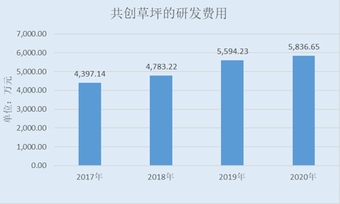 2017-2020年,共创草坪的研发费用分别为4,397.14万元、4,783.22万元、5,594.23万元、5,836.65万元,占营业收入比例分别为3.55%、3.42%、3.6%、3.15%。2021年第一季度的研发费用为1,868.98万元,比去年同期增长了37.83%