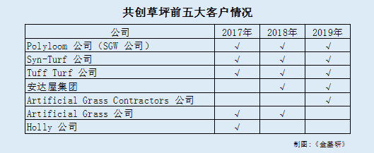 2017年,共创草坪的前五客户包括Synthetic Grass Warehouse, Inc.(以下简称“SGW公司”)、Syn-Turf公司、Tuff Turf公司、Holly International Ltd(以下简称“Holly公司”)、Artificial Grass Corporation S.A.C.及与其受同一控制人控制的 Corporation Bonanza Grass S.A.C.(以下简称“Artificial Grass公司”);2018年,共创草坪的前五客户包括Polyloom公司、Syn-Turf公司、安达屋集团、Artificial Grass公司、Tuff Turf公司;2019年,共创草坪的前五客户包括Polyloom公司、Syn-Turf公司、Tuff Turf公司、安达屋集团、Artificial Grass Contractors, INC(以下简称“Artificial Grass Contractors公司”)。