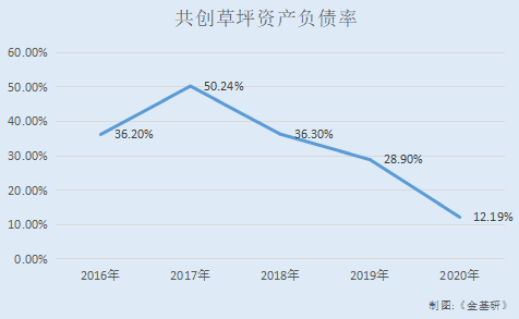 2016-2020年及2021年第一季度,共创草坪的资产负债率分别为36.2%、50.24%、36.3%、28.9%、12.19%、14.36%。