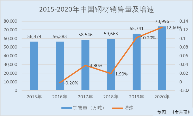2015-2020年,中国钢材销售量分别为56,474万吨、56,383万吨、58,546万吨、59,663万吨、65,741万吨、73,996万吨,2016-2020年分别同比增长-0.2%、3.8%、1.9%、10.2%、12.6%。