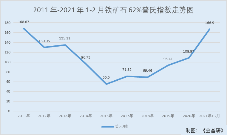 可以看出,铁矿石价格变动周期较长。2021年1月1日-3月15日,普氏指数均值达167.85美元/吨,已经接近历史最高年份。