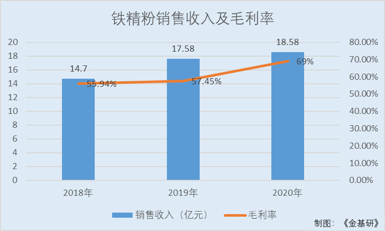 2018-2020年,大中矿业铁精粉的毛利率分别为55.94%、57.45%、69%。